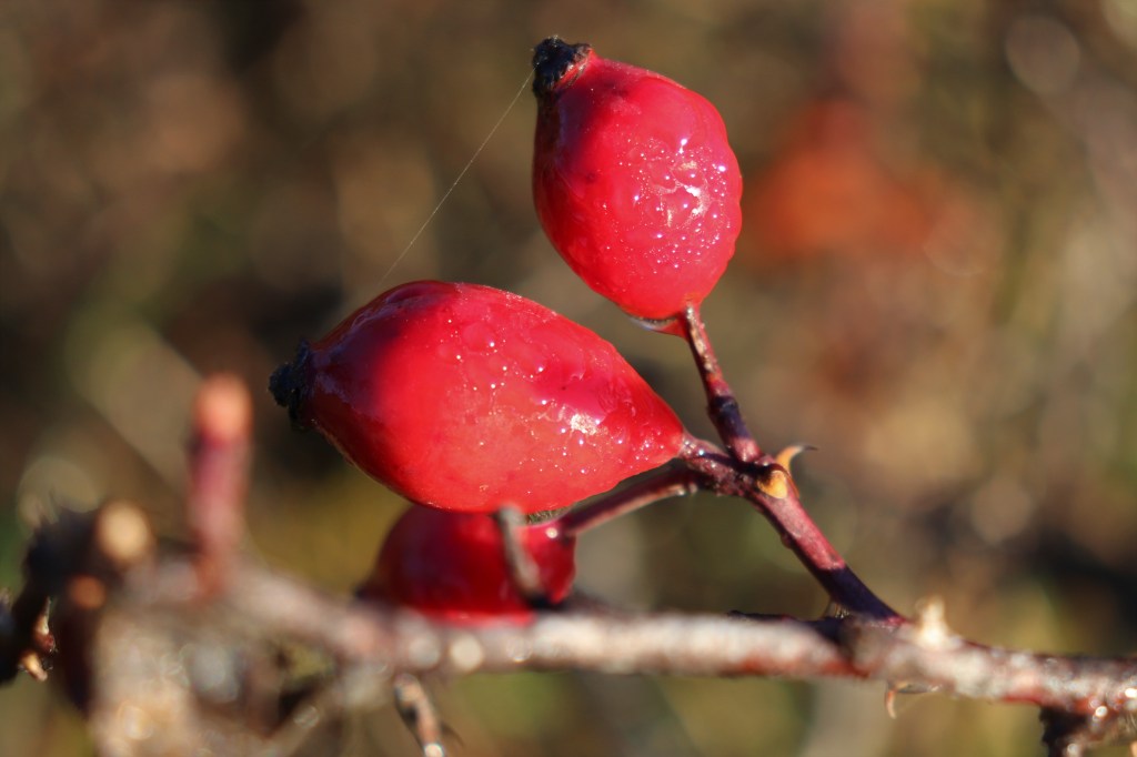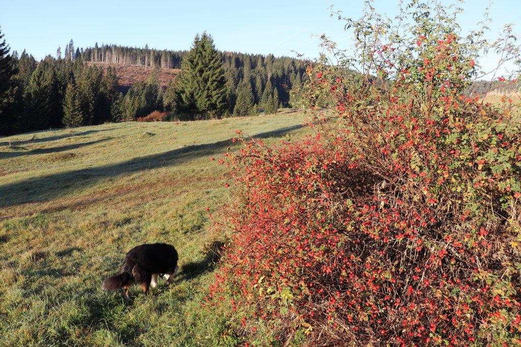 Ci rimettiamo in cammino e cerchiamo di guadagnare la collinetta da dove lui ci stava osservando, giusto per capire se sta ancora lì, se è solo o se è già andato via; si sa mai che avvicinandomi, prima o poi riesco a vederlo da vicino. Il cane adesso è tranquillo e questo significa che probabilmente non ci sono più lupi nelle immediate vicinanze. Mi concentro sul passo e sul respiro e poi incontro loro; le rose selvatiche che in questa stagione mettono in bella mostra le loro bacche rosse. Scatto qualche foto prima di ripartire e chiudere il giro. Il cane annusa in continuazione il terreno; probabilmente i lupi sono passati di lì, o forse ci è passato qualche capriolo, o qualche cinghiale.