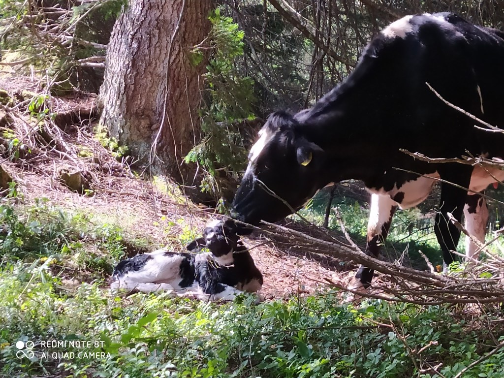 Vacca di razza frisona che ha appena partorito in un bosco di Folgaria. La Frisona è una delle razze che viene selezionata per la grande capacità produttiva; in un periodo di lattazione di 305 giorni riesce a produrre 9.200 kg di latte con un tenore in grasso e proteico del 3.3%. Durata della carriera: 62 mesi (25 produttivi). Poi si macella.
