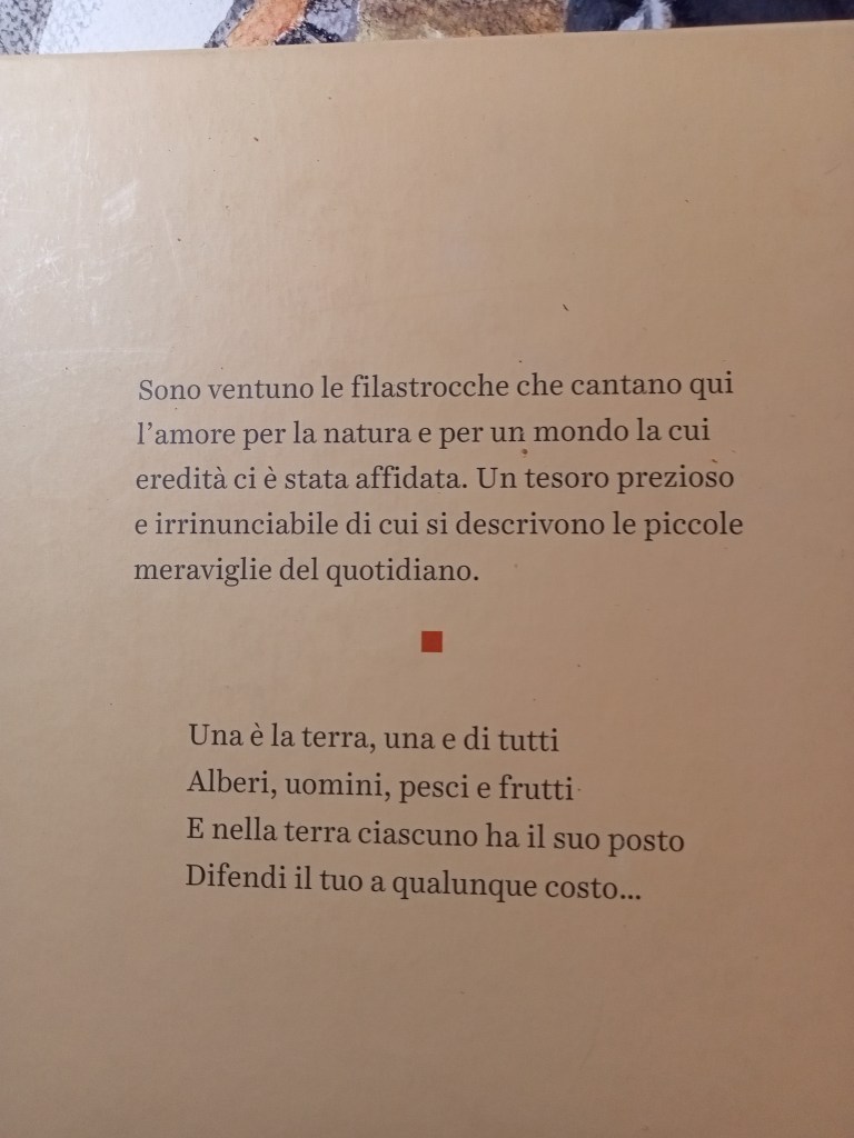 Le filastrocche contenute in questo libro non sono molto poetiche, forse, ma fanno conoscere gli elementi della Natura; ed è un primo passo. Parla di Natura con le parole ed i colori e forse già solo questo, in tempi non facili, soprattutto per i più piccoli, lo rende un libro da regalare; sicuramente è una buona alternativa a un bambolotto di plastica dura che sa solo piangere e muovere il mondo con le sue lacrime.