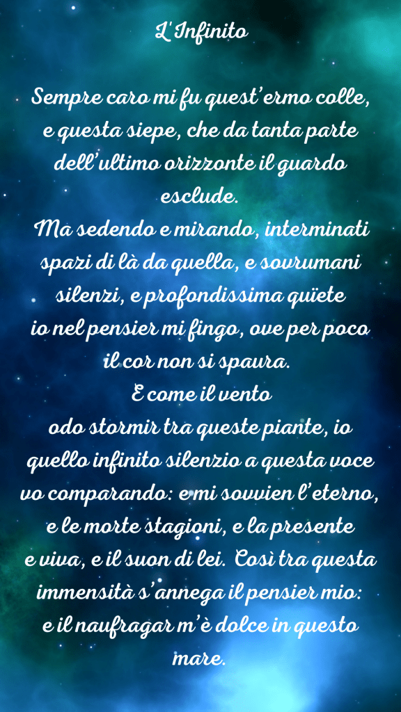 Leopardi non ha ceduto al dolore che la Vita gli ha preparato; lo ha preso e lo ha sublimato in qualche cosa di eterno. A chi si sente fragile, Leopardi ricorda che la fragilità nasconde una potenzialità infinita, e proprio dell’Infinito, lui racconta, scrive e declama con incrollabile direzione ferma, verso il Bello e l’Amore. Di quel che non vede, Leopardi sa immaginare e l’immaginazione diventa il suo senso per un mondo invisibile.