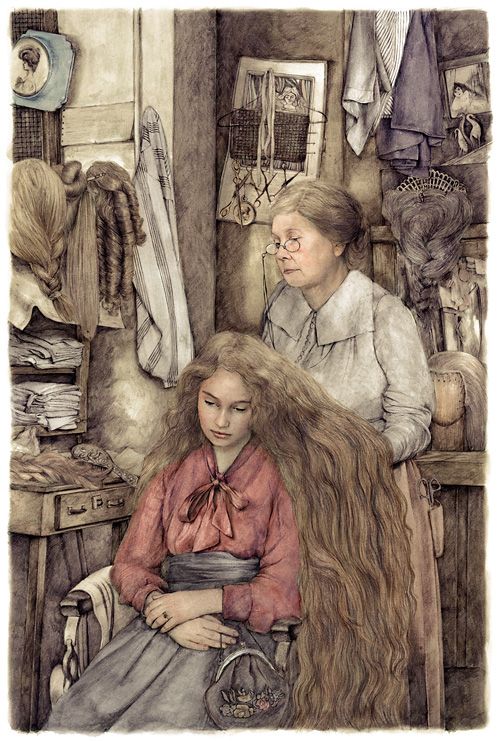 Raperonzolo aveva infatti capelli lunghi e bellissimi, sottili come oro filato. Quando la maga chiamava, ella scioglieva le sue trecce, annodava i capelli in alto, al contrafforte della finestra, in modo che essi ricadessero per una lunghezza di venti braccia, e la maga ci si arrampicava.